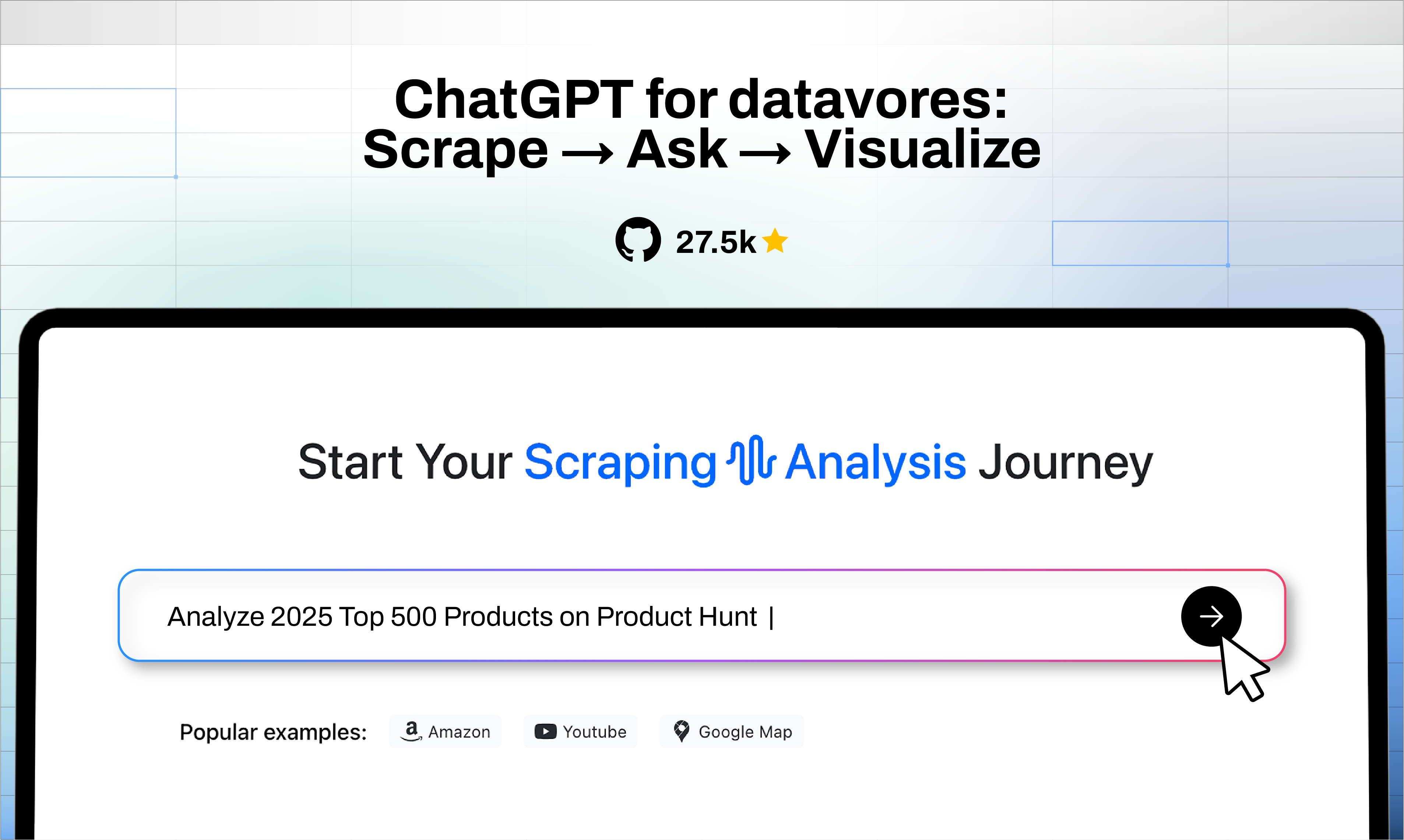 Product Hunt 日榜 | 2025-09-18 | 从网站实时抓取真实数据并导入Univers(我们的电子表格引擎,在GitHub上已获得27.5k星标!)。在这里,您可以提问、通过交互式表格和图表进行可视化分析,还能进行数据切片、多维筛选及导出——所有操作一站式完成。